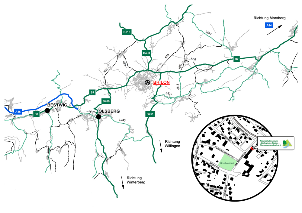 Das Gebäude der Biologischen Station befindet sich in Nachbarschaft des Kreishauses im Südosten von Brilon. Hilfreich bei der Anfahrt ist die Orientierung am Parkleitsystem der Stadt Brilon. Bitte folgen Sie der Ausschilderung zum Parkplatz Kreishaus (blaue Zone).